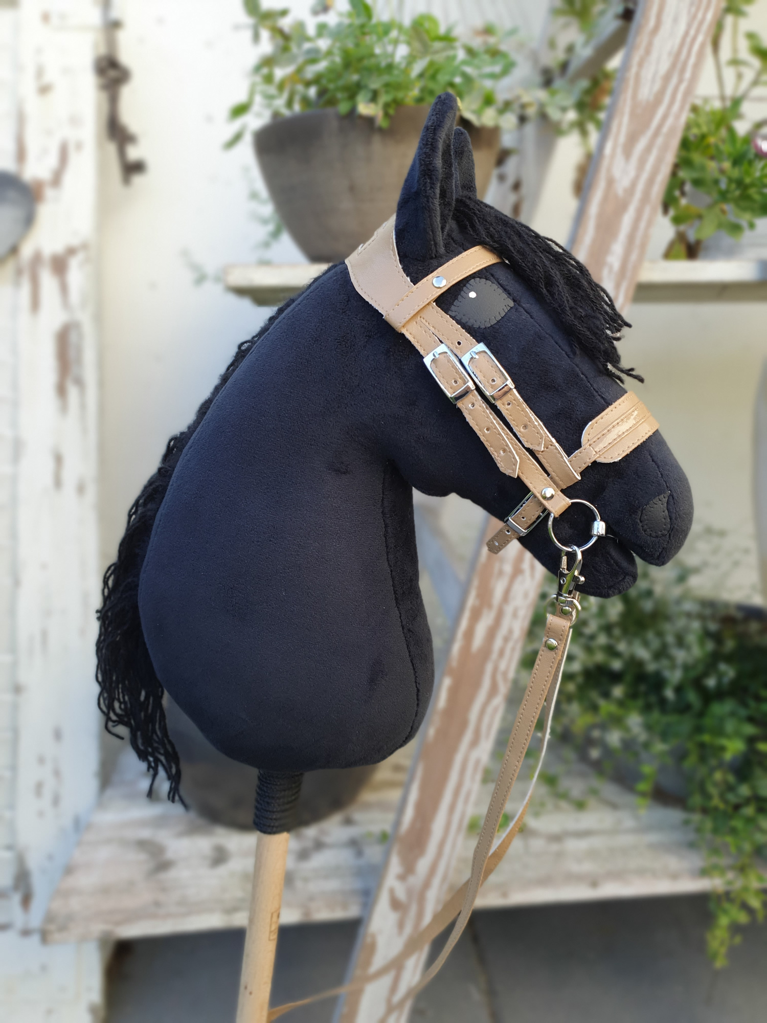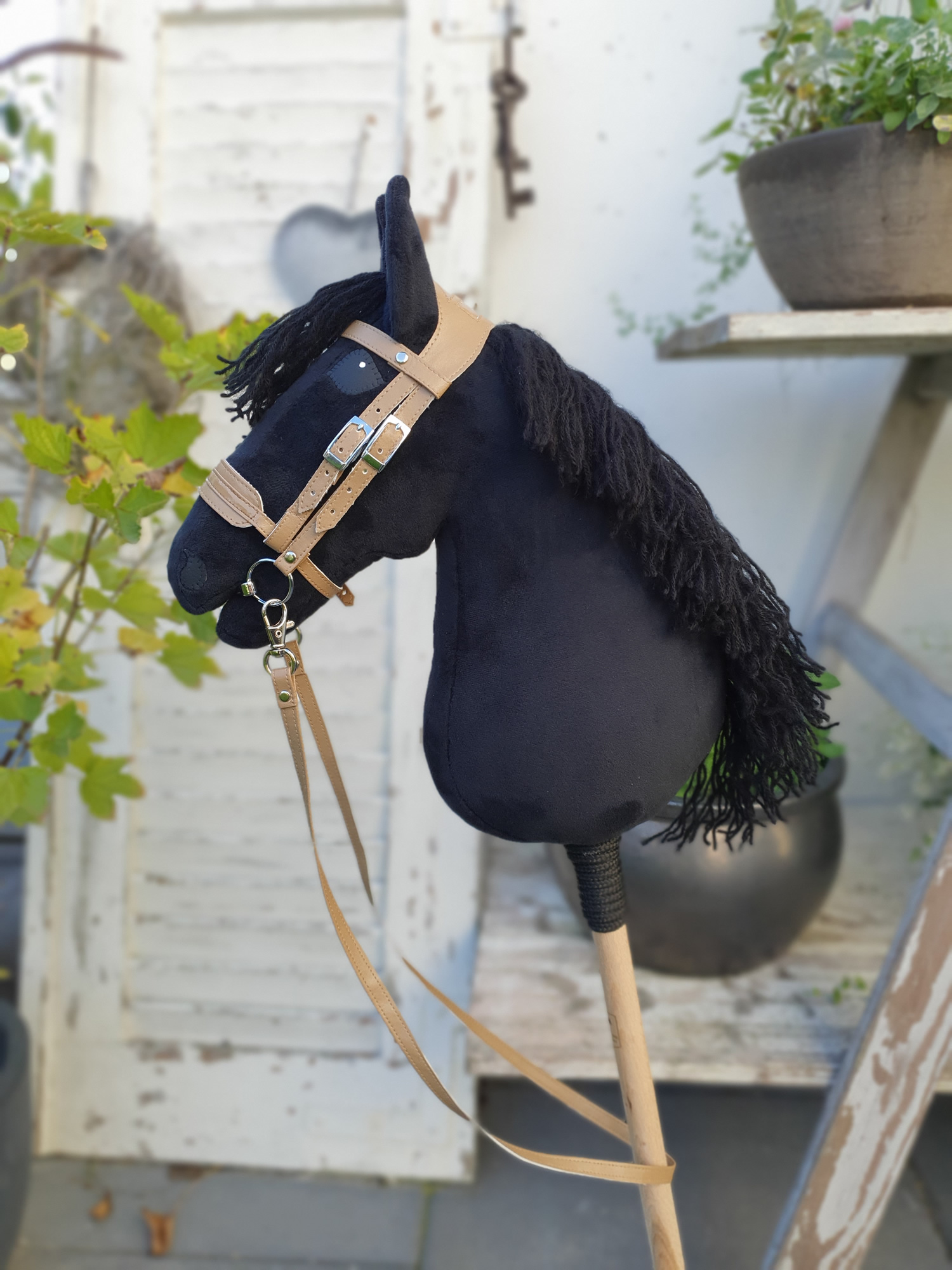 Dein Steckenpferd wird inklusive Zaumzeug und Zügel aus original BioThane® sowie Gebiss (Trense) hochglanz verchromt geliefert.